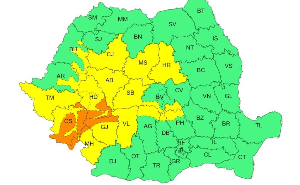 Tot până luni dimineața va fi în vigoare o avertizare Cod galben. Aceasta vizează județele Alba, Harghita, Mureș, Sibiu, , Cluj, Bihor, Hunedoara, Arad, Timiș, Caraș-Severin, Mehedinți, Gorj, Vâlcea, Brașov, Argeș, Dâmbovița și Prahova.