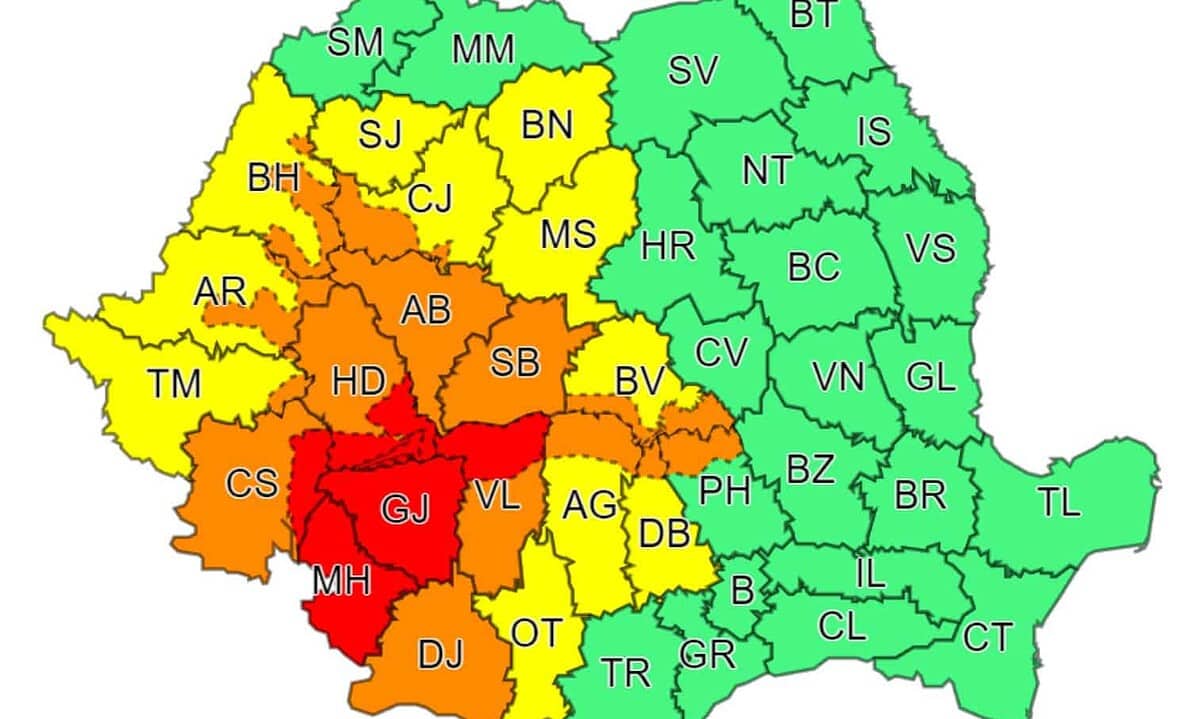 În aceste județe se vor semnala averse torențiale și izolat căderi de grindină. Local cantitățile de apă