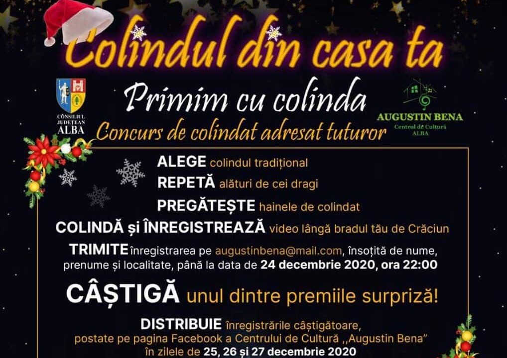 „Colindul din casa ta este un concurs on-line de colinde prin care încercăm să arătăm că putem păstra tradițiile românești, chiar dacă trebuie să respectăm regulile stricte impuse din cauza pandemiei COVID – 19. Astfel îi provocăm pe toți cei care iubesc colindele și tradițiile specifice Crăciunului să ne arate că locul cel mai bun pentru a colinda este acasă, lângă cei dragi, în siguranță. Noi vom asculta cu mult drag toate colindele și urările primite, iar, în zilele de Crăciun, vom posta multe dintre acestea pe pagina noastră de Facebook, de unde le veți putea distribui și voi. Am pregătit și premii surpriză pentru participanți, însă credem că premiul cele mai important este emoția pe care o vor simți interpretând colindul românesc”, a spus Alexandru Pal, managerul Centrului de Cultură „Augustin Bena” Alba.