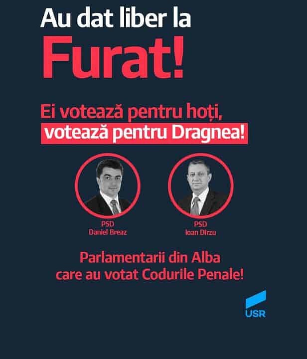 De remarcat este și faptul cum parlamentarii absentează în mod repetat de la serviciu. Spre exemplu, la ședința Camerei Deputaților în timpul căreia s-au adoptat Codurile Penale, doar USR i-a avut prezenți pe toți cei 27 de deputați, demonstrând încă o dată că USR este singurul partid care își respectă alegătorii.” se arată într-un comunicat de presă emis de USR Alba.