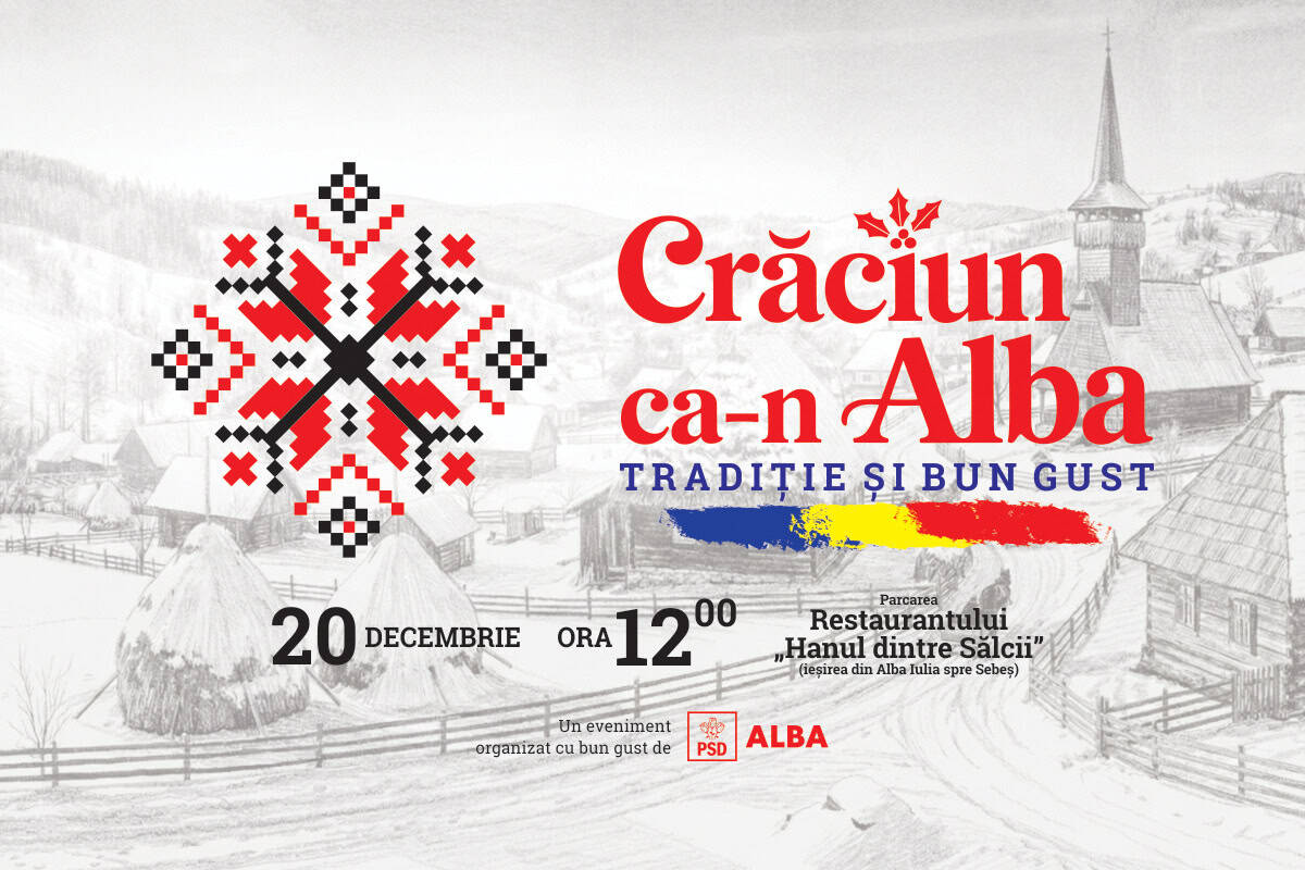 „Crăciun ca-n Alba. Tradiție și bun gust” va avea loc în parcarea Restaurantului „Hanul dintre Sălcii” (ieșirea din Alba Iulia spre Sebeș). Evenimentul este organizat cu bun gust de Partidul Social Democrat Alba.