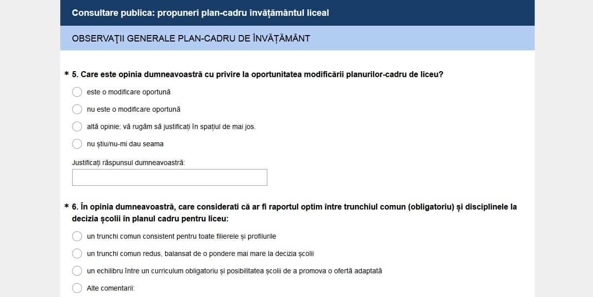 Întrebările vizează "oportunitatea modificării planurilor cadru de liceu", respectiv dacă este sau nu oportună, "raportul optim între trunchiul comun obligatoriu și disciplinele la decizia școlii în planul cadru", respectiv un trunchi comun consistent pentru toate filierele, un trunchi comun redus, balansat de o pondere mai mare la decizia școlii, un echilibru între curriculumul obligatoriu și posibilitatea școlii de a promova o ofertă adaptată.