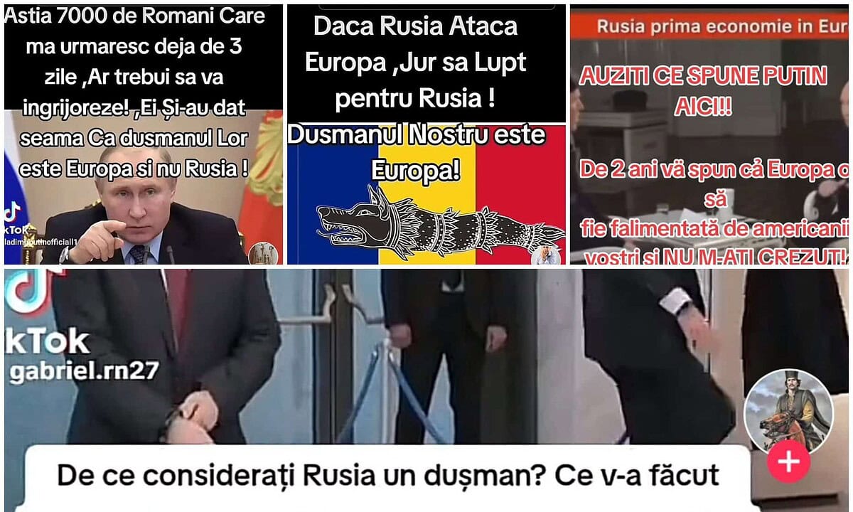 „Putin: România este un stat dictatorial care urmează ordinele Uniunii Europene. Va trebui să-i eliberez” – așa sună unul dintre mesajele ilustrate cu imaginea președintelui Rusiei Vladimir Putin sau cu steagul Rusiei, care au apărut recet pe TikTok.