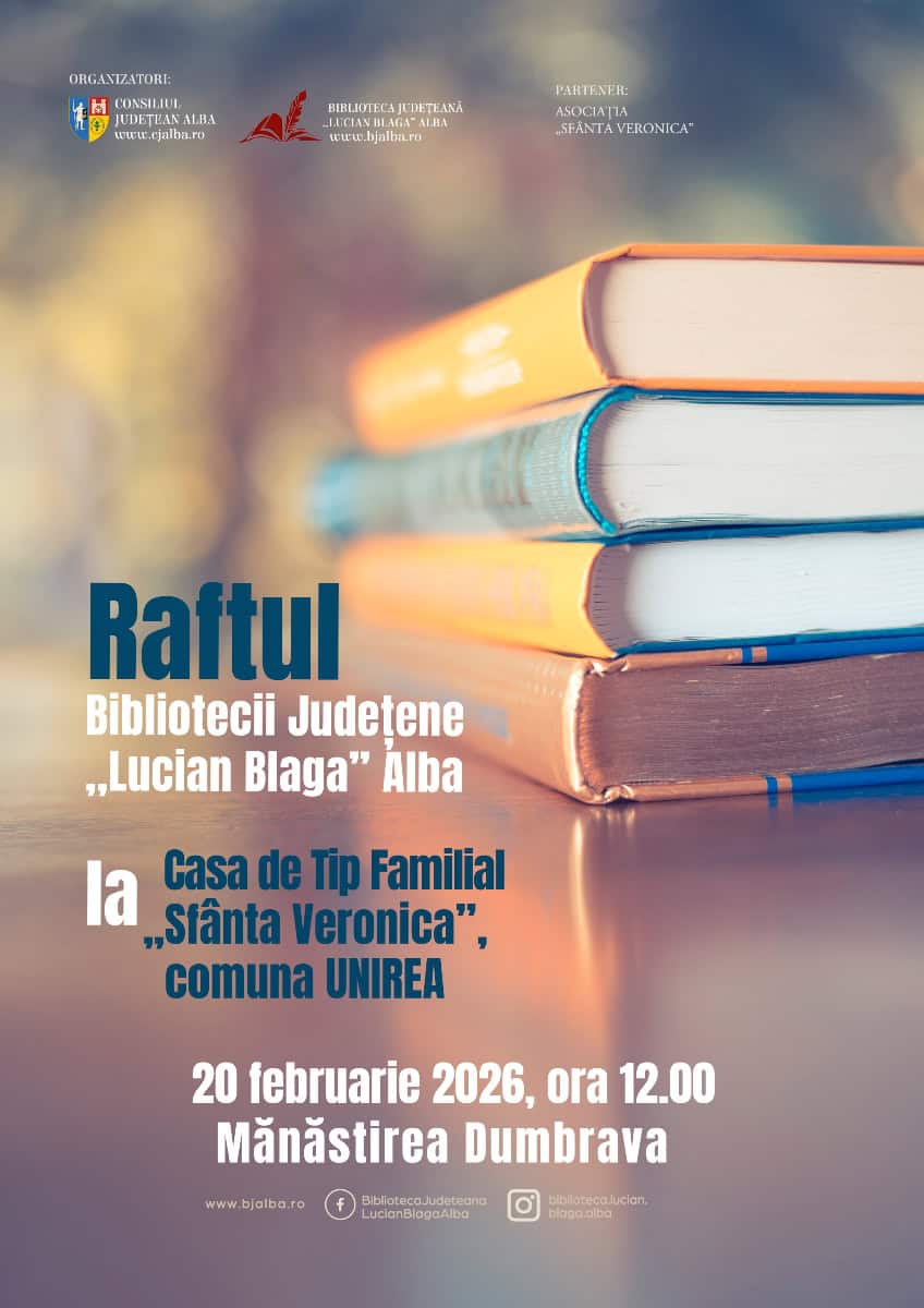 Deschiderea raftului bibliotecii va fi vineri, 20 februarie6, de la ora 12:00, la Casa de Tip Familial „Sfânta Veronica”, de la Mănăstirea Dumbrava.