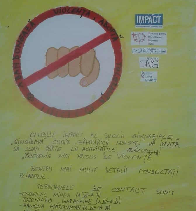 Unul din reprezentanții Clubului Impact, prof. Dan Moldovan, a declarat: „Acțiunile evenimentului „Cu zâmbiricii la joacă” și „Mesajul meu antiviolență” fac parte din primul proiect inițiat de către membri clubului școlii – „Prietenie mai presus de violență”, proiect ce își dorește să rezolve problema identificată de aceștia și anume faptul că actele de violență s-au înmulţit! Proiectul se încheie în săptămâna „Școala altfel: Să știi mai multe, să fii mai bun” cu un spectacol de teatru-forum, intitulat sugestiv: Violenţa dăunează grav prieteniei.”