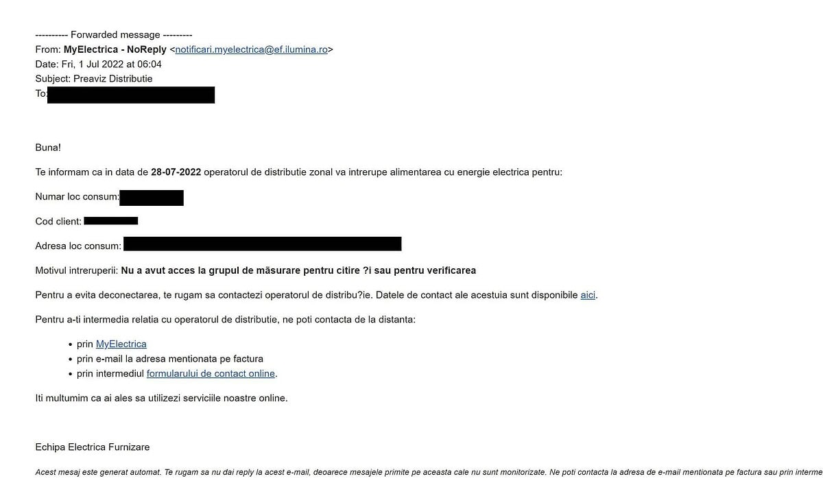 ”Nu a avut acces la grupul de măsurare pentru citire și/sau pentru verificare” este mesajul pe care îl primești de la Electrica, la ora 6.00, într-o notificare de sistare a distribuției de energie electrică, chiar dacă plătești lunar, online, curentul.