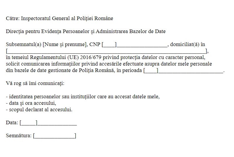 Pentru a afla cine a accesat datele tale din baza de date a Poliției, poți trimite o solicitare scrisă către: