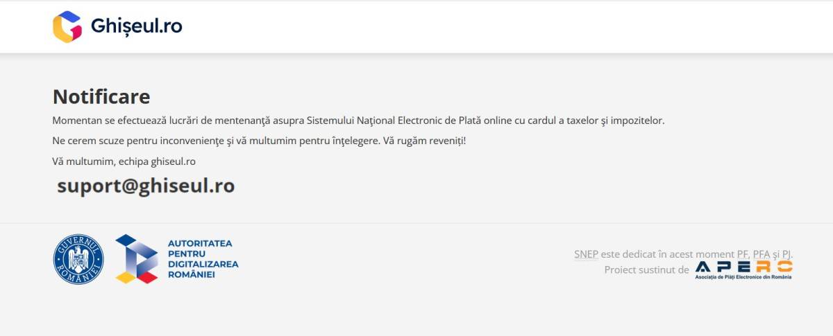 Cetățenii care vor să-și plătească taxele sau impozitele la începutul anului 2026, online, folosind platforma ghiseul.ro, nu au această opțiune. Se fac lucrări de mentenanță.