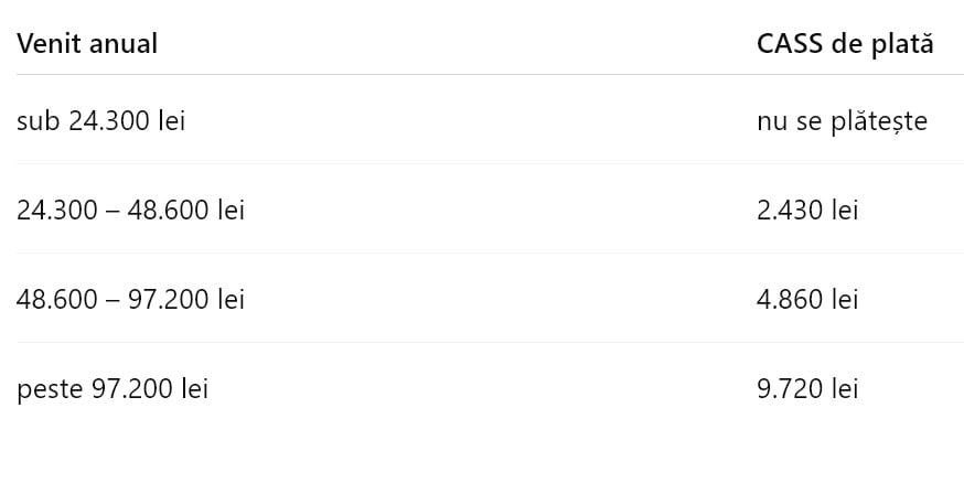 Contribuția de asigurări sociale de sănătate (CASS) este de 10% și devine obligatorie dacă veniturile cumulate din aceste surse depășesc 6 salarii minime brute pe economie.