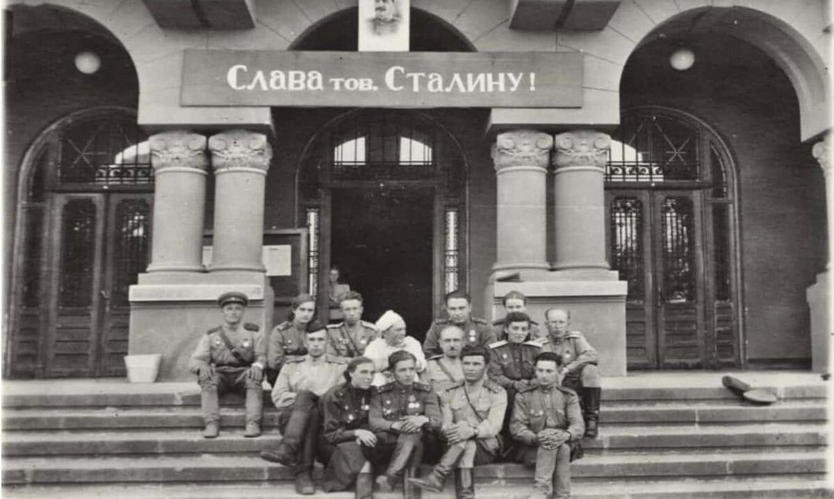Deasupra intrării monumentale a clădirii a fost montată lozinca „Slavă tovarășului Stalin!”