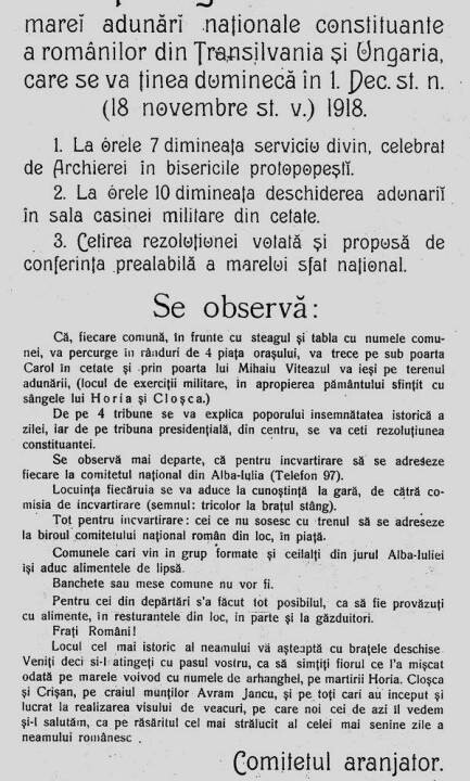 „Programul marei adunari constituante a românilor din Transilvania și Ungaria, care se va ținea Dumnecă, 1. Dec. st.n (18 Novembre st.v.) 1918“ a cuprins trei puncte. Partricipanții erau anunțați că „serviciul divin va începe la orele 7 dimineața“. Descinderea Adunării Naționale era planificată pentru ora 10, în casina militară din Cetate, actuala Sală a Unirii. Cel mai important punct din program era „cetirea rezoluțiunei votată și propusă de conferința prealabilă a marelui sfat național“. Ultimul puct presupunea dezbaterea articolelor Hotărârii de Unire,