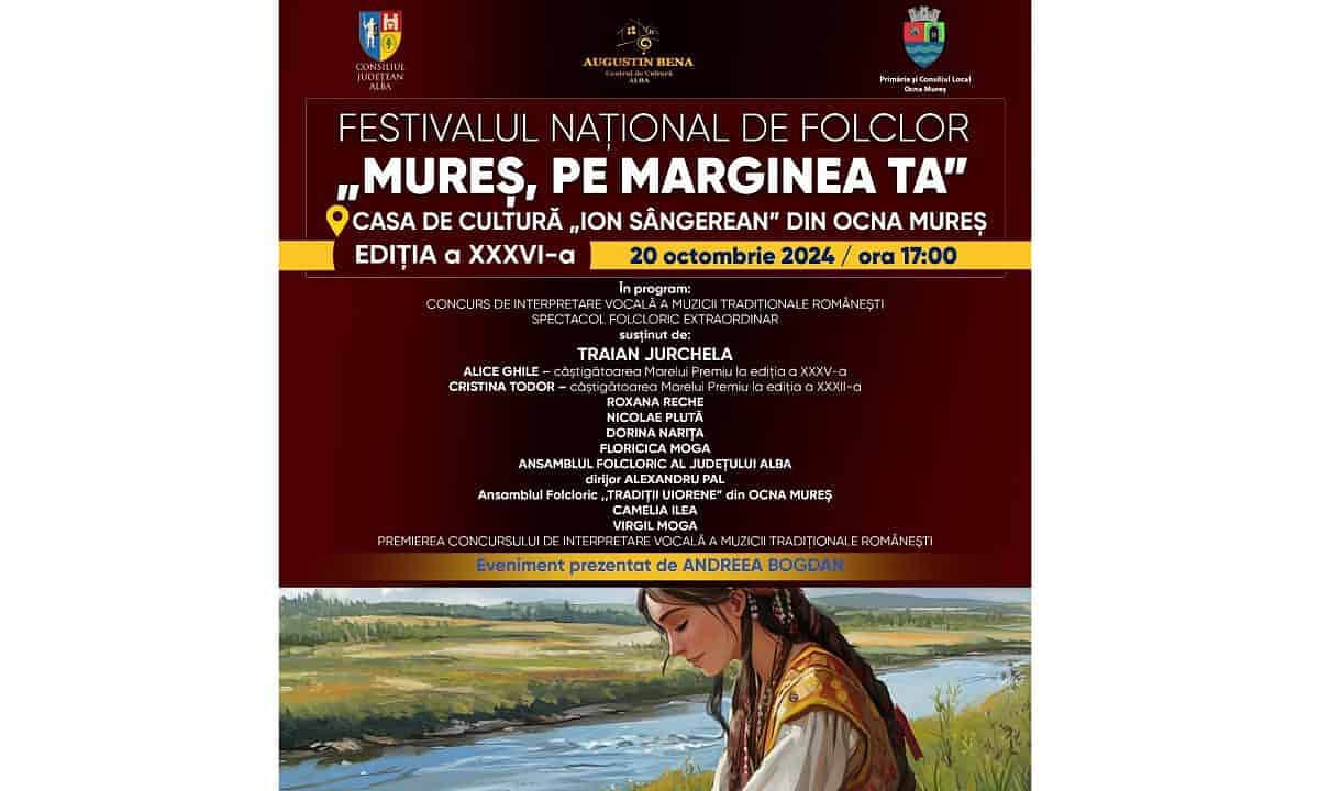 La Casa de Cultură „Ion Sângerean” din Ocna Mureș va avea loc duminică, 20 octombrie, cea de-a XXXVI-a ediție a Festivalului Național de Folclor „Mureș, pe marginea ta”, un eveniment de referință în peisajul cultural românesc. Festivalul, care se desfășoară anual în orașul Ocna Mureș are ca principal obiectiv promovarea tinerilor interpreți de muzică vocală tradițională, contribuind astfel la conservarea și valorificarea Patrimoniului Cultural imaterial.