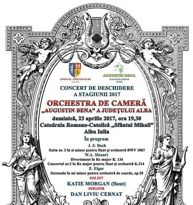 „Concertul deschide oficial stagiunea 2017 a Orchestrei de Cameră „Augustin Bena” a judeţului Alba şi presupune un amplu eveniment pregătit în detaliu de colegii din cadrul orchestrei. Suntem onoraţi de prezenţa invitatei speciale din concert, flautista britanică Katie Morgan, o artistă cu recunoaştere internaţională, şi sperăm să fie un eveniment frumos, pe gustul publicului din Alba Iulia” a spus Alexandru Pal, managerul Centrului de Cultură „Augustin Bena” Alba.