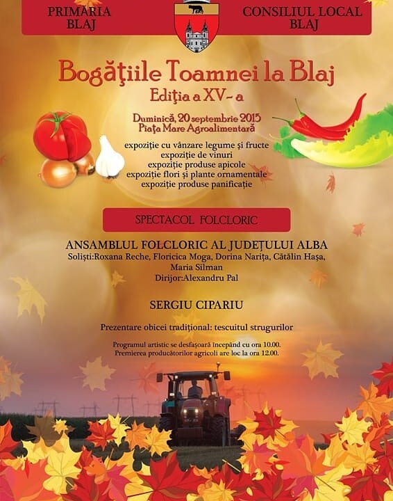 Organizatorii vor oferi producătorilor agricoli de pe Valea Târnavelor ocazia de a-și expune cele mai frumoase produse din recolta anului 2015 pe standurile ce vor fi amenajate special pentru această sărbătoare, transmit reprezentanţii Primăriei Blaj.
