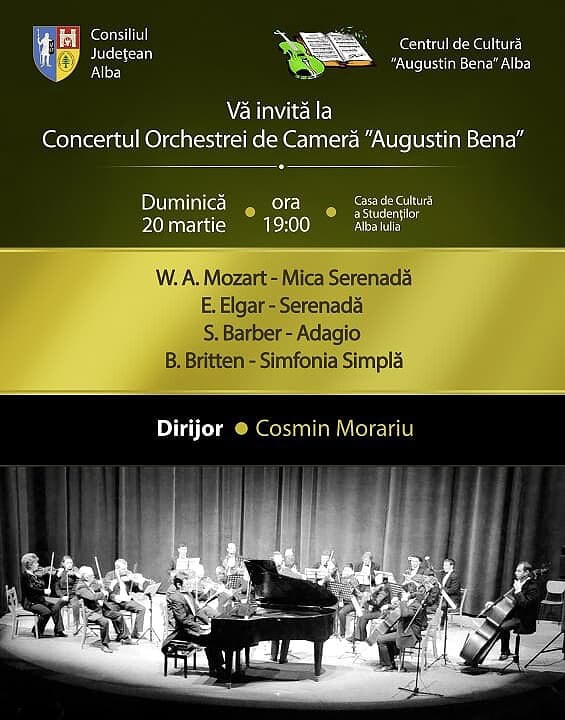 DUMINICĂ: Concert al Orchestrei de Cameră „Augustin Bena”, la Casa de Cultură a Studenților din Alba Iulia. Invitat, dirijorul Cosmin Morariu