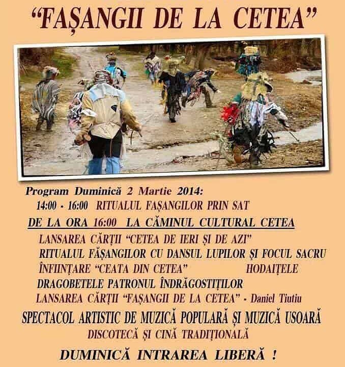 Anul acesta „Fășangii de la Cetea” va avea loc în data de 2 martie. Ritualul fășangilor din sat se va desfășura între orele 14.00-16.00, după care la Căminul Cultural Cetea vor avea loc lansări de carte, spectacol artistic de muzică populară și muzică ușoară, discotecă, cină dar și altele.
