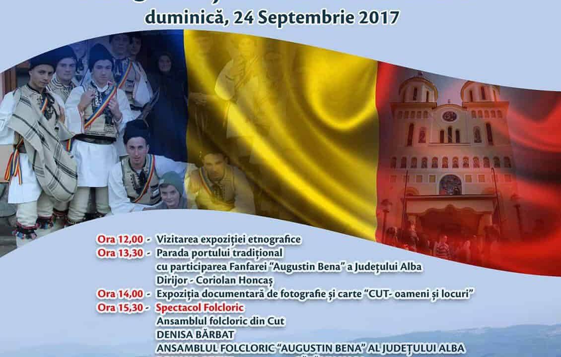 Cei prezenți vor putea să urmărească, de la ora 15.30, un spectacol folcloric susținut de: Ansamblul folcloric din Cut, Denisa Bărbat, Ansamblul folcloric „Augustin Bena” al județului Alba, Roxana Reche, Cătălin Hașa, Nicolae Plută, Maria Filimon, Floricica Moga, Dorin Narița, Nicolae Tuhuț, Marinela Baba, conducerea muzicală Alexandru Pal, coregrafia Alexandra Oargă și Flaviu Mîrza.