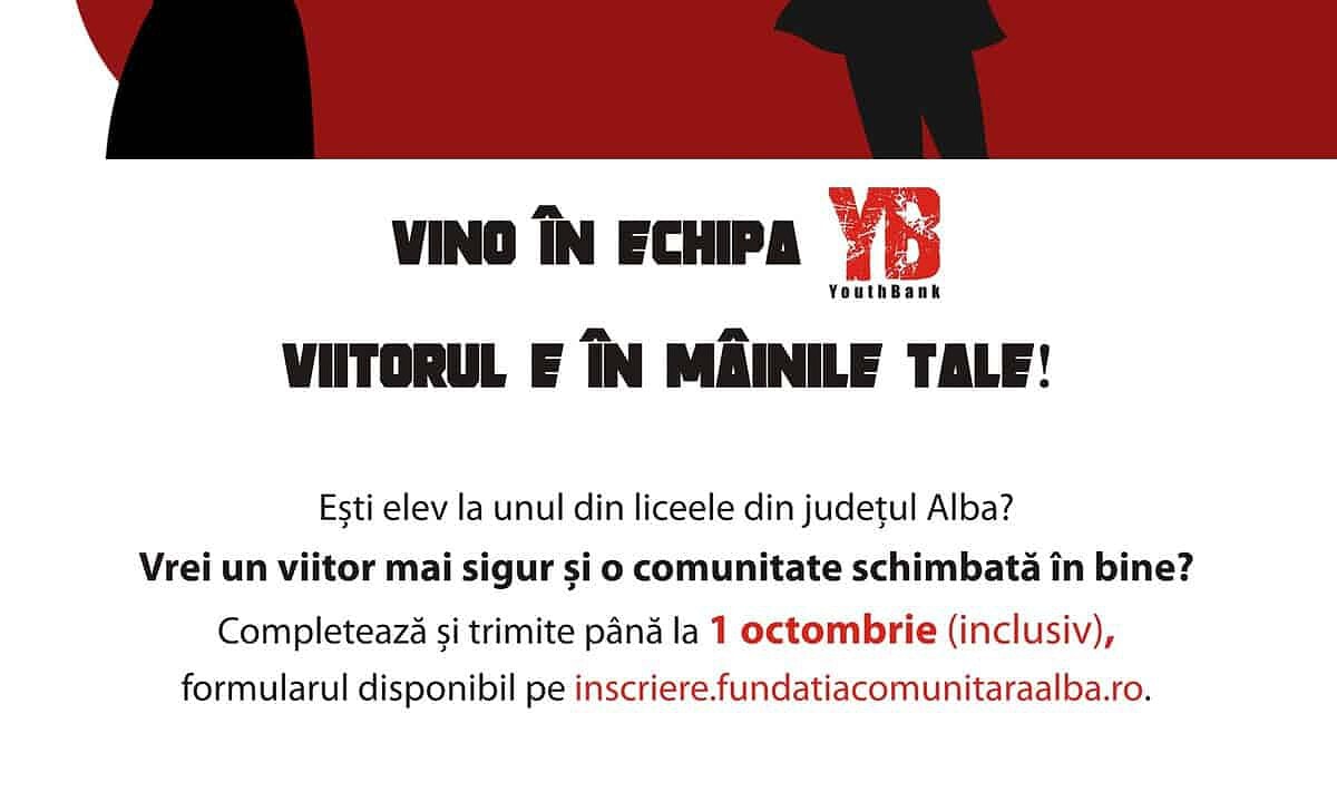 Așadar, ești elev la unul din liceele din județul Alba? Vrei să intri în Echipa YB? Completează și trimite până la 1 octombrie 2017 (orele 23.59) formularul disponibil pe www.inscriere.fundatiacomunitaraalba.ro.
