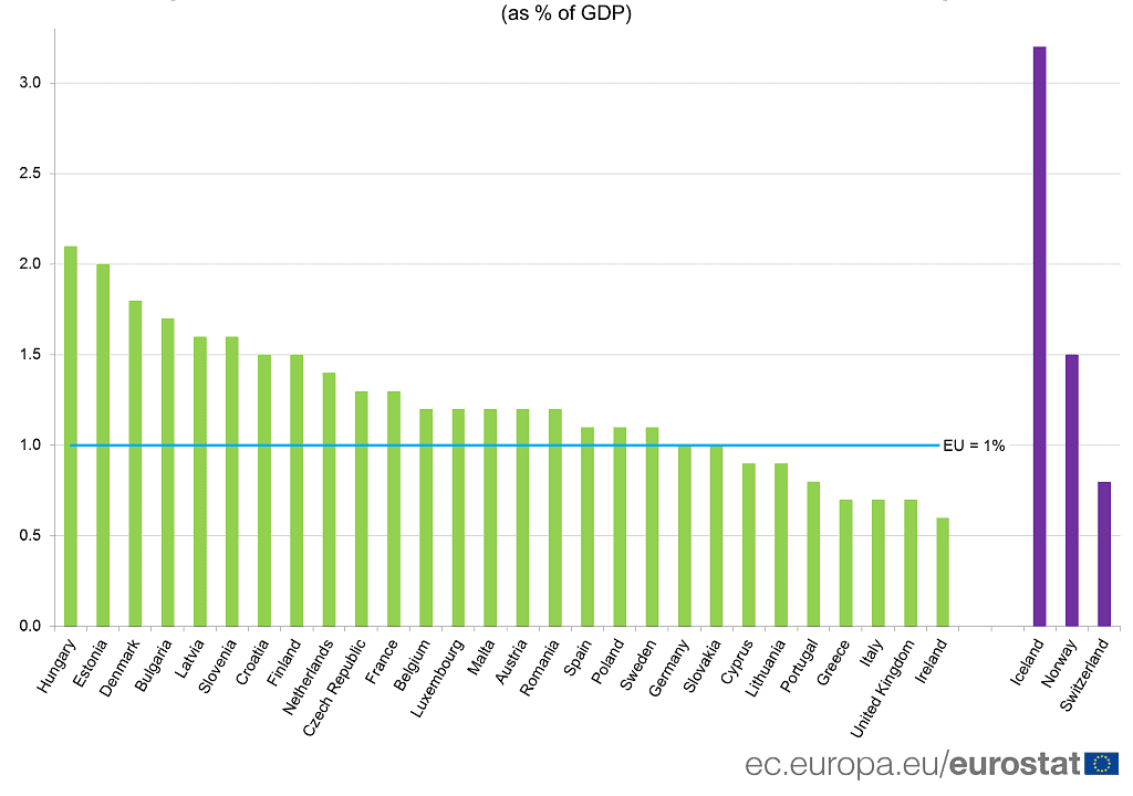 Potrivit raportului publicat de Eurostat, în 2015, cele 28 de state membre ale Uniunii Europene au raportat cheltuieli guvernamentale de aproape 153 de miliarde de euro pentru „recreație, cultură și religie” , echivalentul a 1% din PIB-ul UE. Comparativ, sumele cheltuite pentru alte domenii cheie, cum ar fi „protecție socială” (echivalentul a 19,2% din PIB în 2015), „sănătate” (7,2%), „educație” (4,9%) sau chiar „apărare” (1,4%) sunt mult mai ridicate. Mai puțin se cheltuie pentru „protecția mediului” (0,8%) și „locuințe și facilități pentru comunitate” (0,6%).