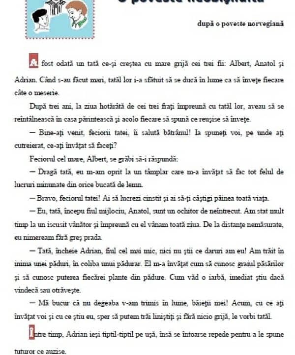 Elevii au avut de răspuns unor întrebări pe baza unor texte primite ("Înţelepciunea bătrânilor" - după o poveste orientală - Testul 1; "O poveste neobişnuită" - după o poveste norvegiană - Testul 2), prin care să confirme că au înţeles conţinutul poveştii, ordinea derulării evenimentelor, că pot identifica personajele. La ultimul subiect - cerinţa cu numărul 15, au avut de redactat o compunere.