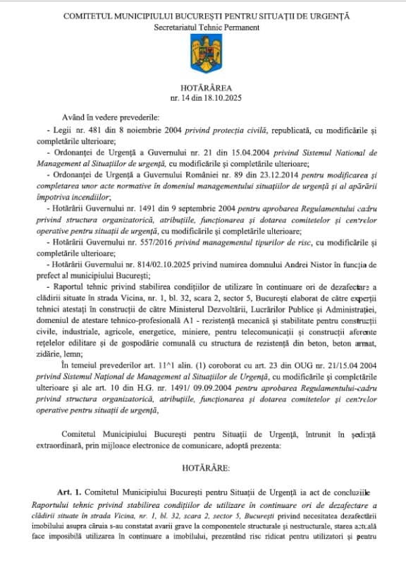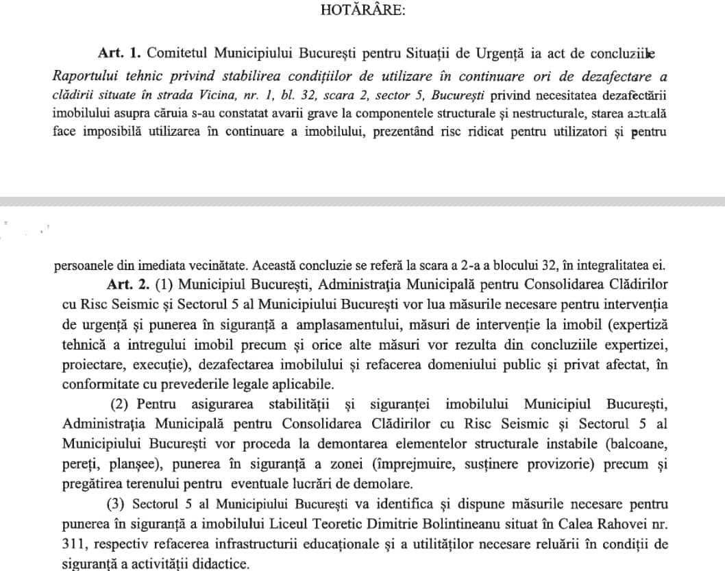 Prin actul adoptat sâmbătă, 18 octombrie, s-a hotărât ca Municipiul București, Administraţia Municipală pentru Consolidarea Clădirilor cu Risc Seismic și Sectorul 5 al Municipiului București să dispună măsurile necesare pentru:
