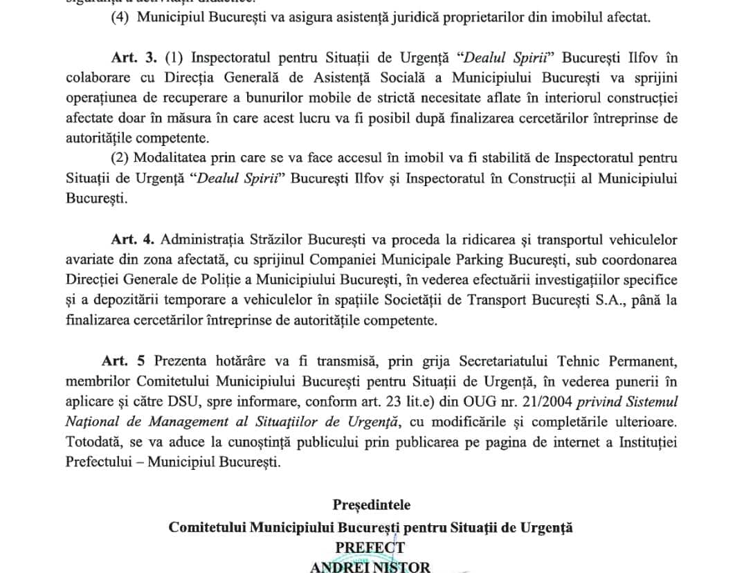 Municipiul București va asigura asistență juridică proprietarilor din imobilul afectat.