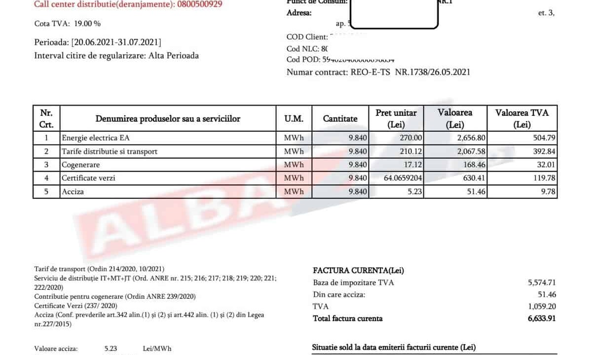 În urmă cu câteva zile, o altă familie din Alba Iulia a primit o factură la energie electrică de 27.808 de lei pentru un consum de 39.313 kwh în perioada 12 iulie 2021 - 10 august 2021.