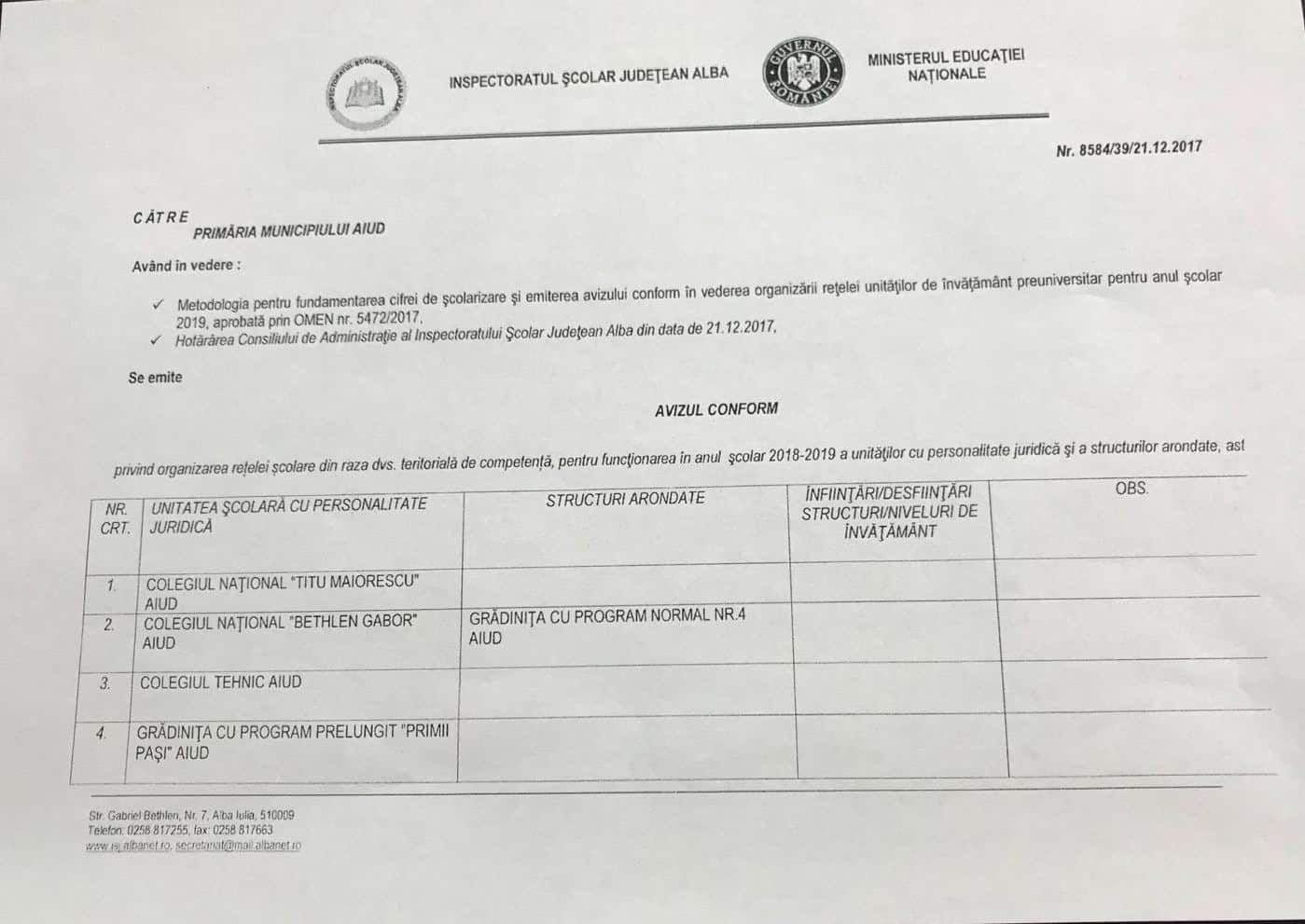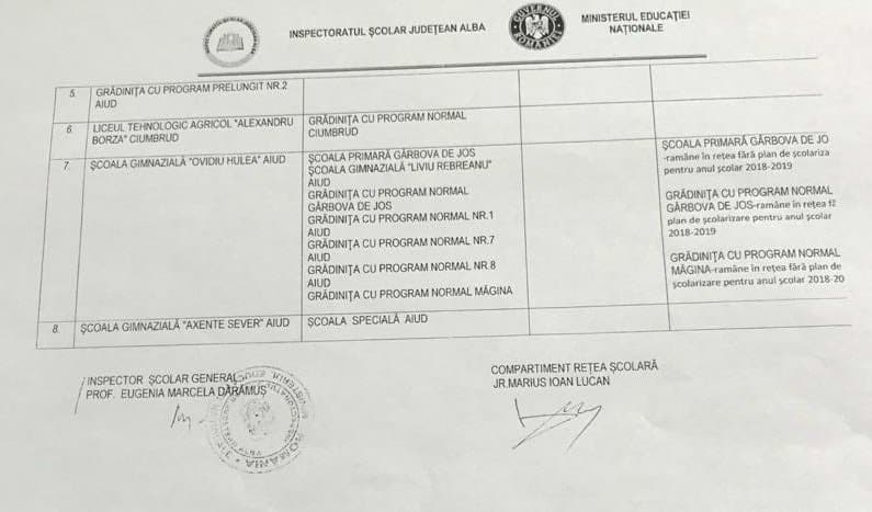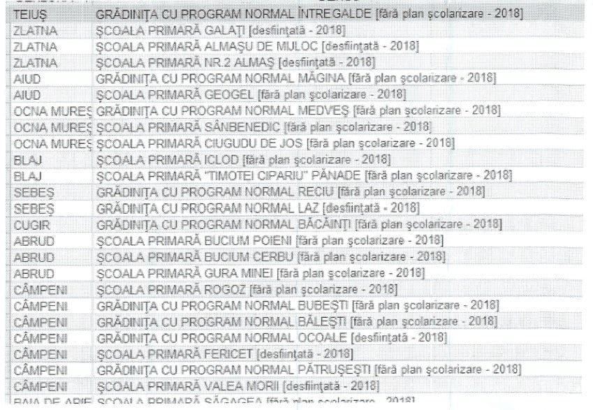 Astfel, un material de lucru (Anexa 1) de la nivelul Inspectoratului Școlar Județean Alba confirmă că mai multe unități de învățământ din județ nu au un plan de școlarizare și vor fi închise în 2018. Iată și câteva exemple: trei școli primare din Zlatna (Școala primară Galați, Școala primară Almașu de Mijloc, Școala primară nr. 2 Almaș), Grădinița cu program normal Laz din localitatea Sebeș, Grădinița cu program normal Ocoale din localitatea Câmpeni sau Școala primară Valea Morii din localitatea Câmpeni. Iar acestea reprezintă doar o mică parte!