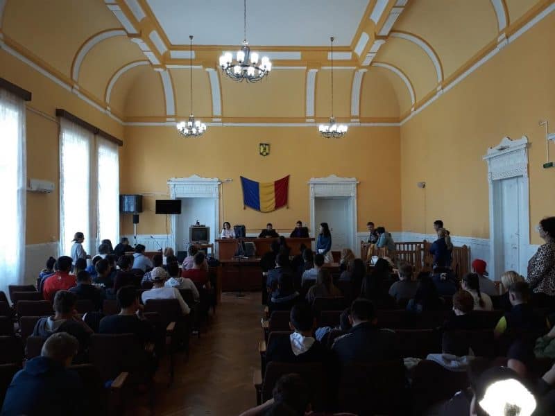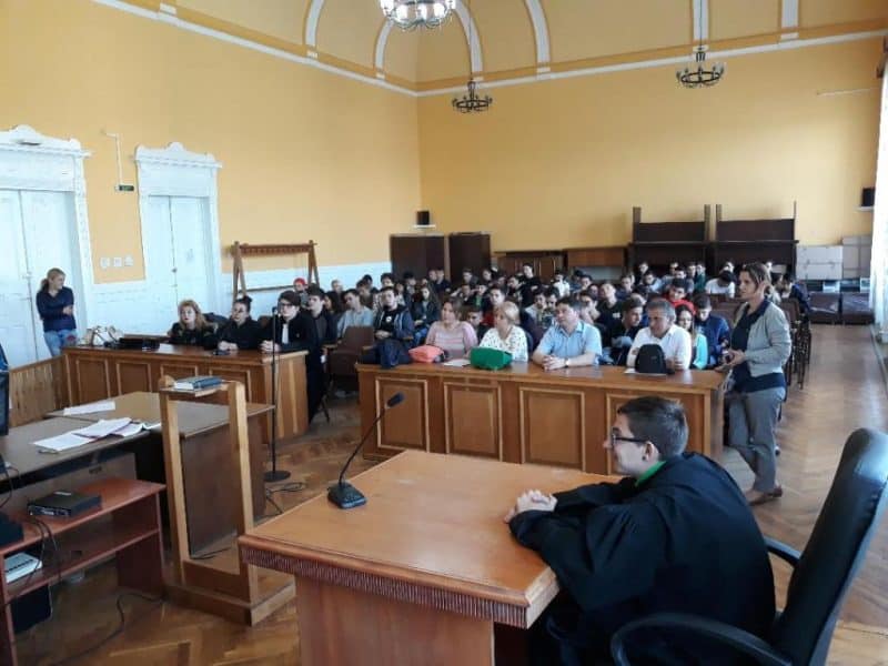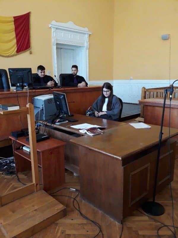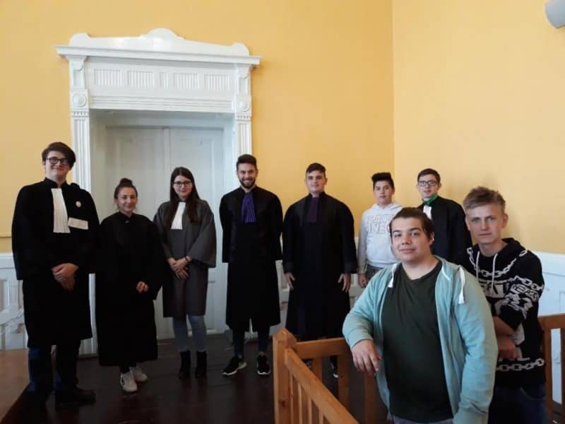 Pentru a înţelege mai bine cum se desfăşoară un proces şi importanţa fiecărui participant, a fost improvizată scena unui proces penal imaginar în care câţiva liceeni au acceptat să îmbrace robele specifice funcţiei de judecător, procuror, grefier sau avocat şi alături de ceilalţi participanţi la un proces penal (inculpaţi, martori), selectaţi tot din rândul liceenilor prezenţi, au ocupat în sala de judecată poziţiile specifice fiecăruia.