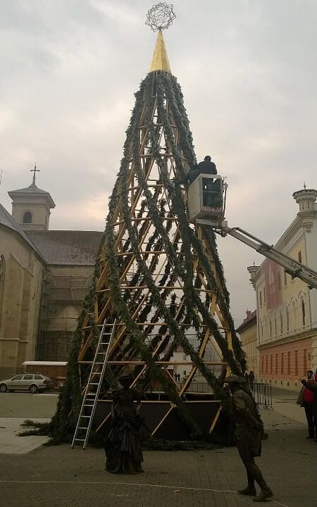 FOTO: A fost montat bradul de Crăciun, de 16 metri înălţime, din zona Piaţa Cetăţii. Cum arată atracţia principală a sărbătorilor din Alba Iulia