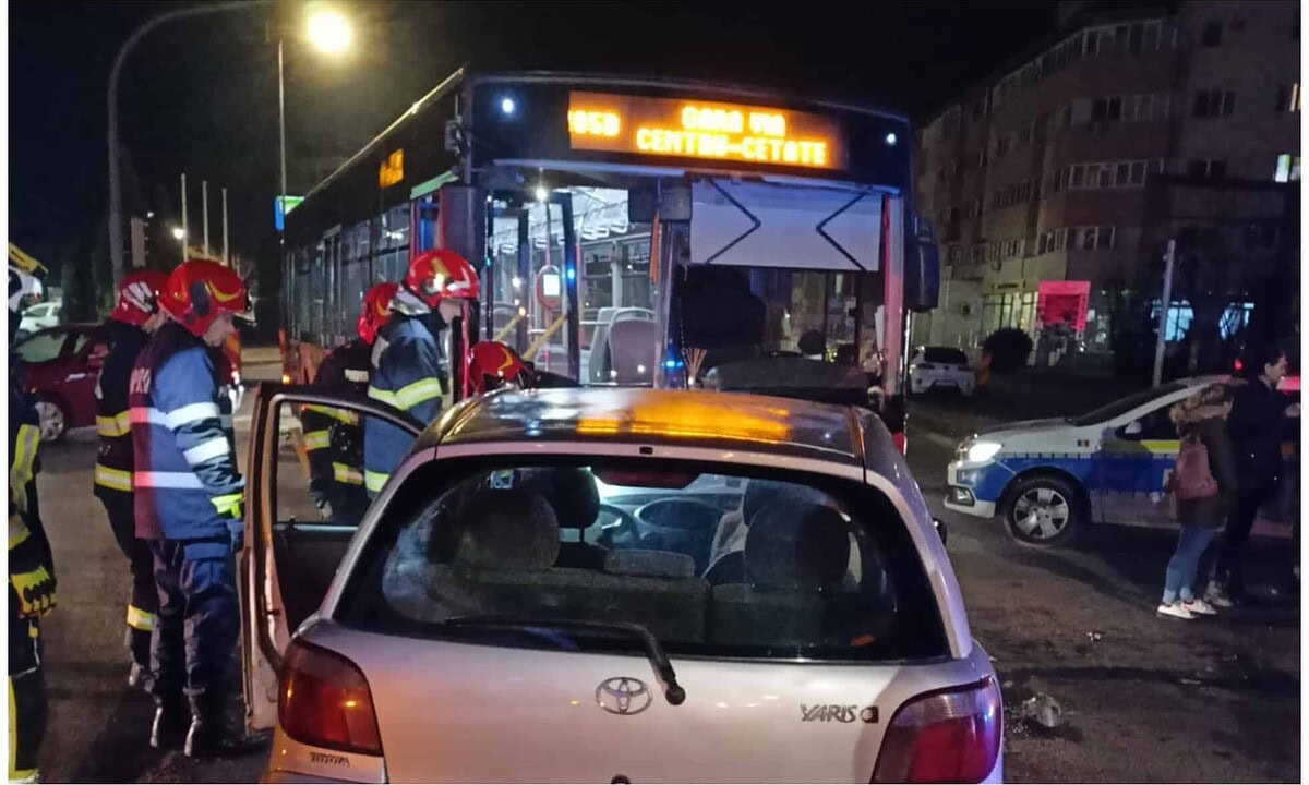 Este vorba despre un accident rutier produs între un autobuz și un autoturism.