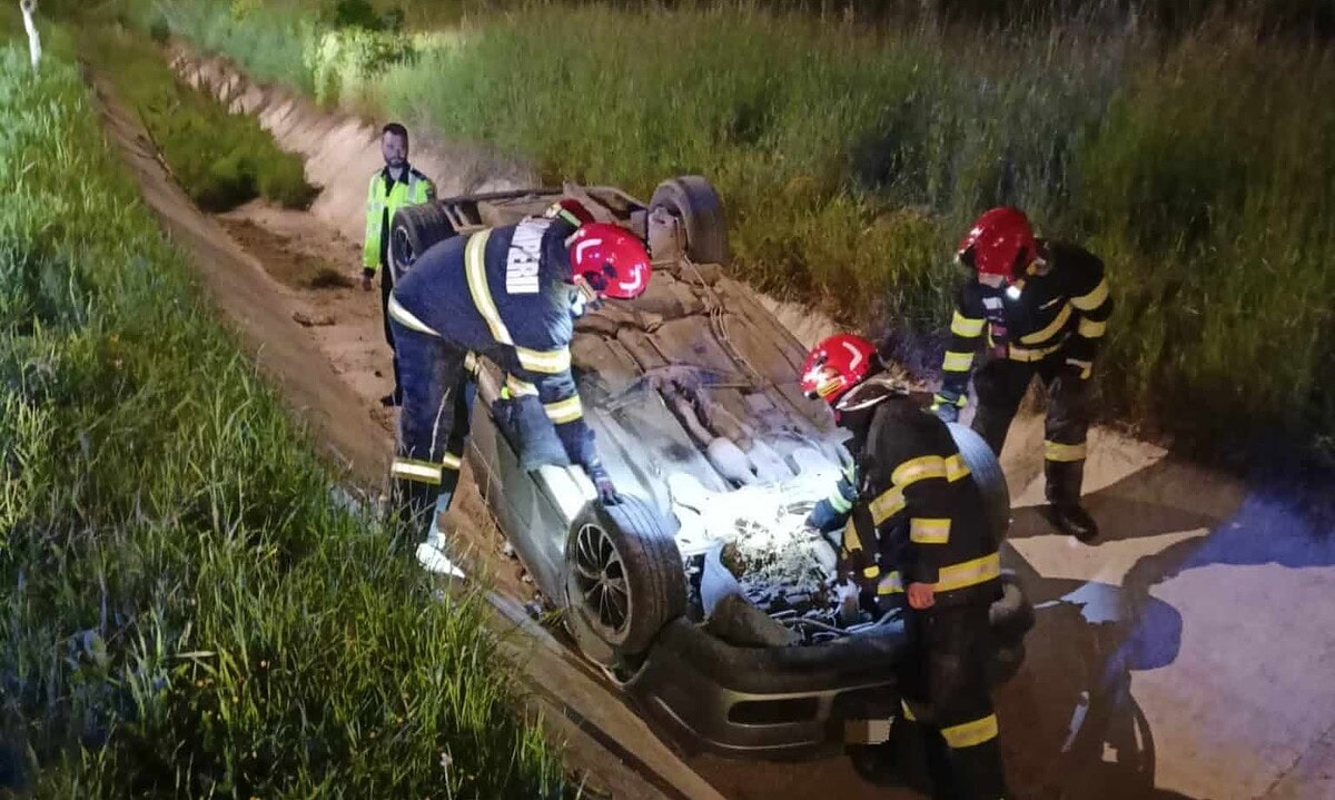 Este vorba despre un autoturism răsturnat înt-un șanț colector de apă pluvială.