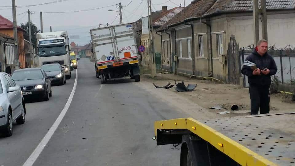 FOTO: Accident între două autoturisme și un camion în centrul comunei Unirea, la intersecția cu Ocna Mureș