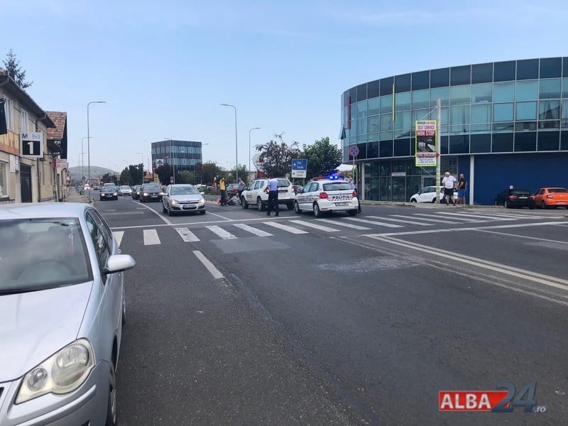 FOTO ACCIDENT la Alba Iulia: Biciclist acroşat de un autoturism, pe strada Tudor Vladimirescu. Trafic îngreunat