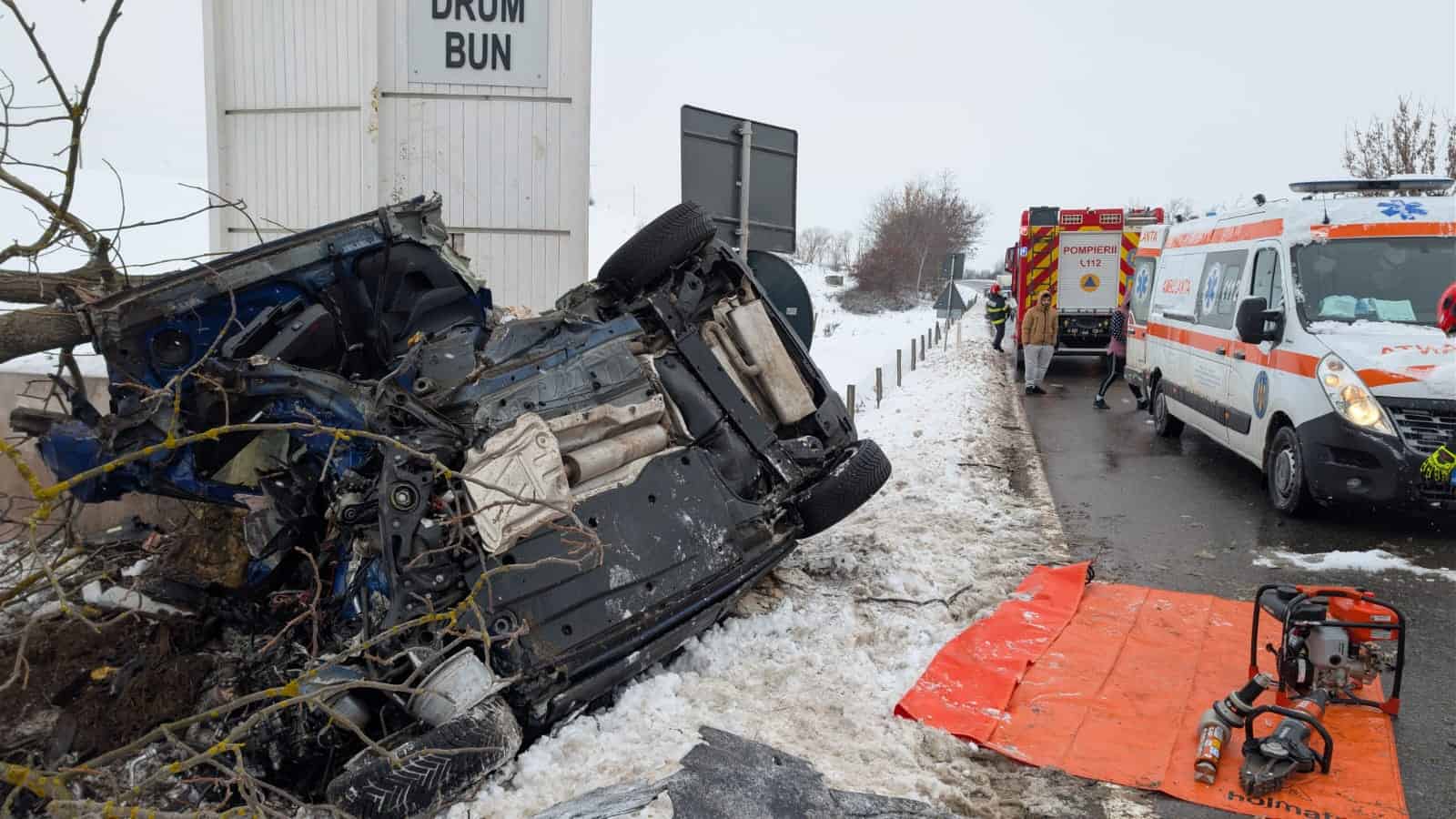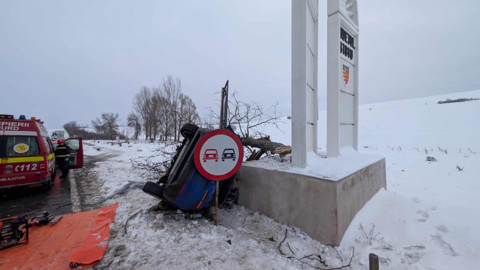 FOTO: Accident mortal pe DN1 lângă Miercurea Sibiului. Un bărbat a decedat după ce s-a răsturnat cu mașina