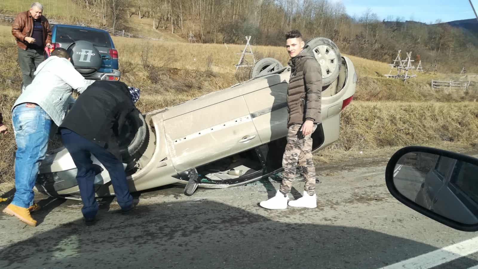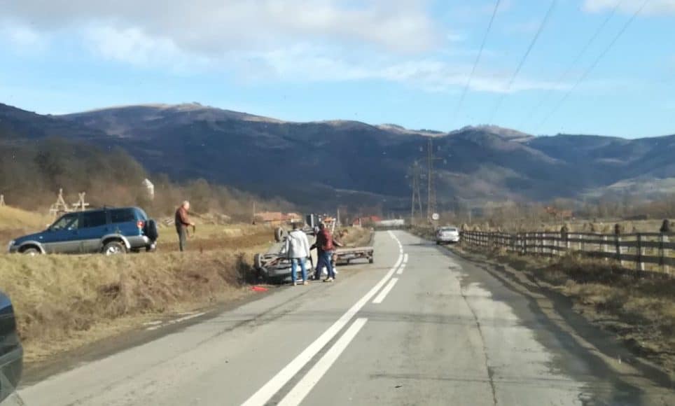 FOTO: ACCIDENT pe DN 74, între Alba Iulia și Zlatna. O mașină a ajuns cu roțile în sus, pe marginea drumului