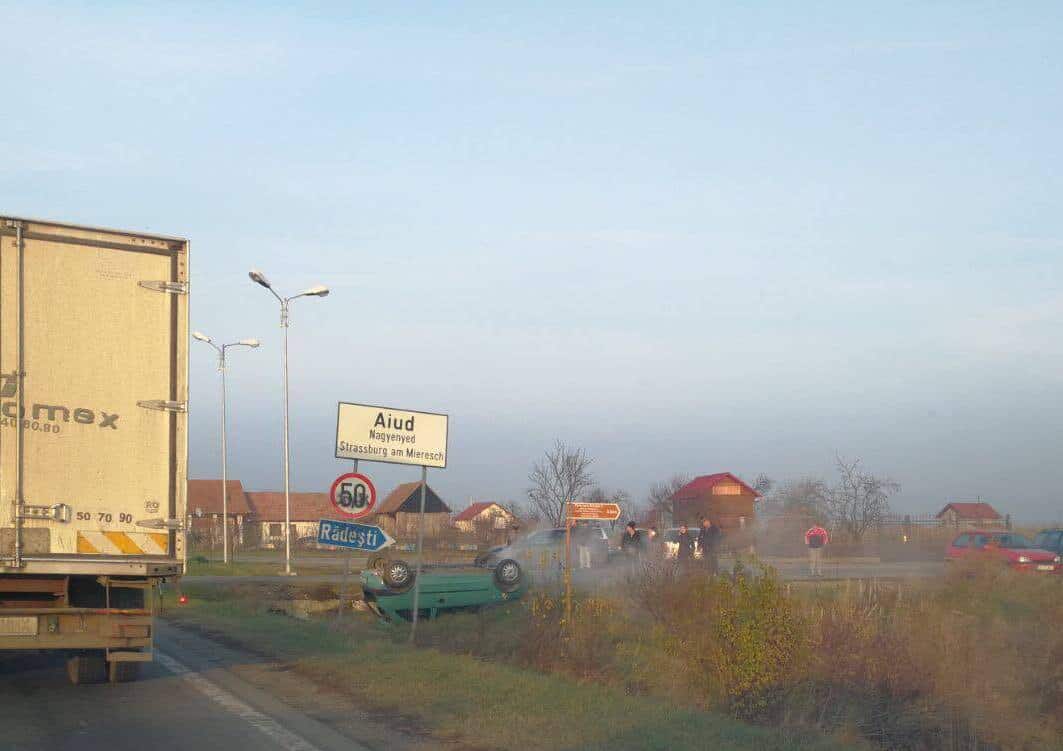 FOTO UPDATE ACCIDENT pe DN1, la intrare în Aiud dinspre Alba Iulia. Maşină răsturnată în şanţ