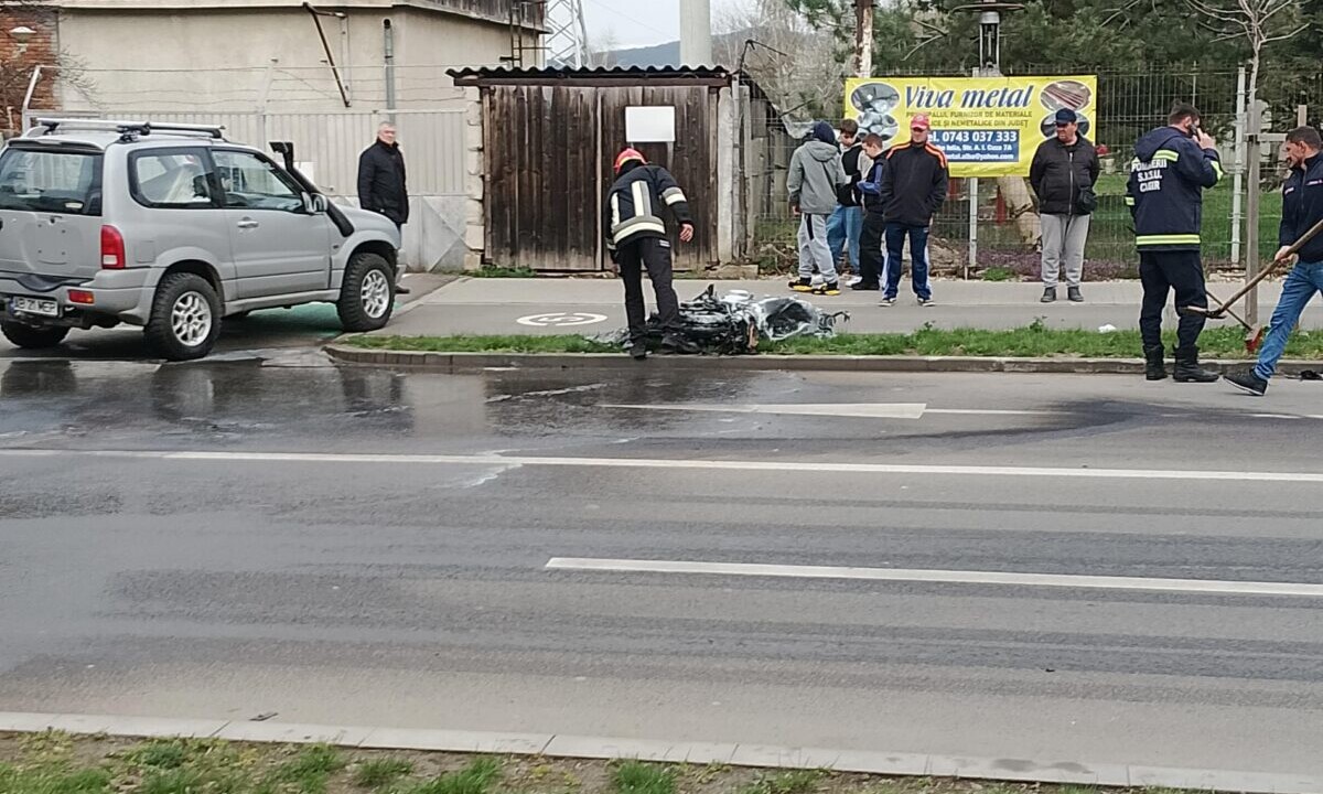 FOTO ACCIDENT RUTIER în Cugir: O motocicletă a luat foc, după ce a fost lovită de o autoutilitară. Ce s-a întâmplat