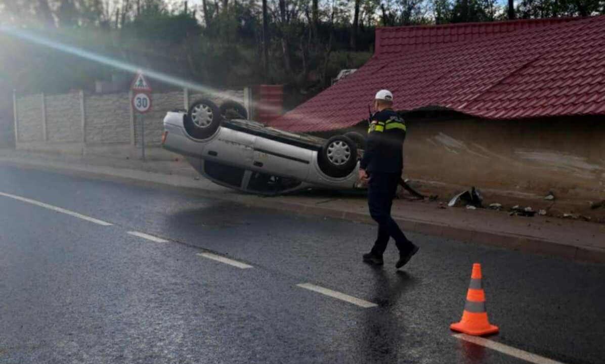 UPDATE: Autoturismul s-a răsturnat pe trotuar, în zidul unui imobil.