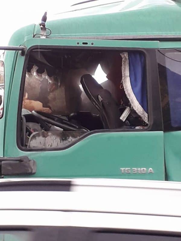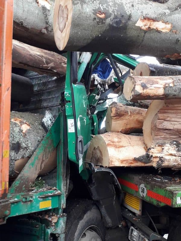 În urma impactului, buștenii transportaţi de primul camion au spart cabina vehiculului din spate și avariat-o în mare parte. Șoferul a scăpat ca prin minune după ce un buștean a pătruns prin parbriz.