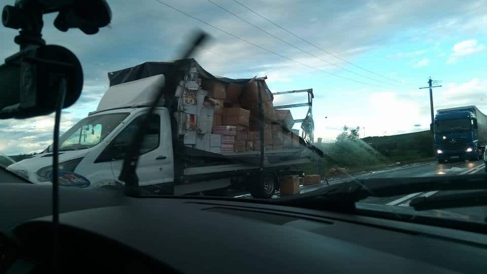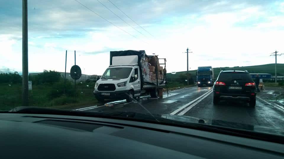 De pe imagini se poate observa că prelata camionetei a fost ruptă, iar o parte din încărcătură a ajuns pe șosea.