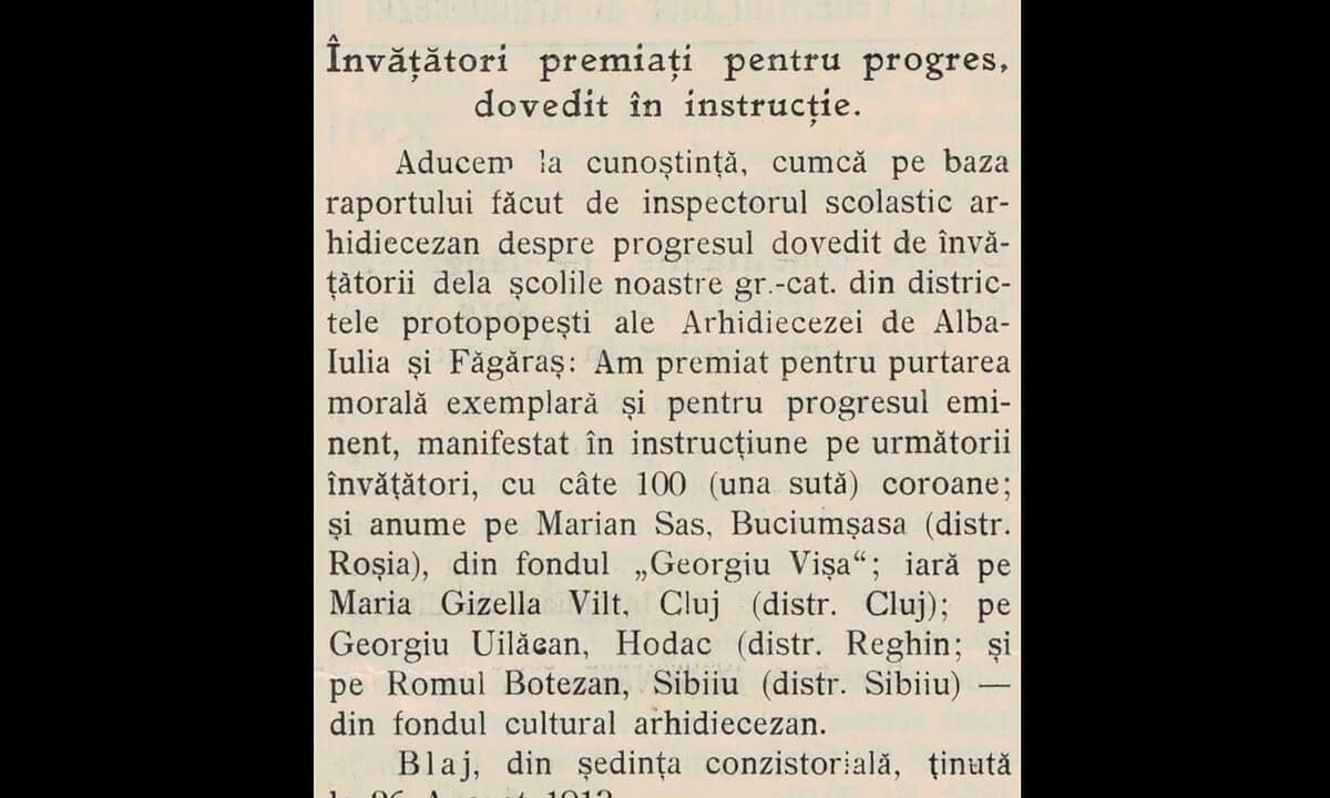 Am premiat pentru purtarea morală exemplară și pentru progresul eminent, manifestat în instrucție pe următorii învățători, cu câte 100 (una sută) coroane; și anume pe Marian Sas, Buciumșasa (distr. Roșia), din fondul „Georgiu Vișa”, iară pe Maria Gizella Vilt, Cluj (distr. Cluj); pe Georgiu Uilăcean, Hodac (distr. Reghin); și pe Romul Botezan, Sibiiu (distr. Sibiu) - din fondul cultural arhidiecezan.