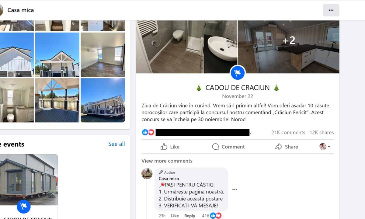 FOTO ATENȚIE: Tentativă de înșelăciune pe Facebook. Hackerii vor să îți fure datele cu un concurs în care poți câștiga o căsuță