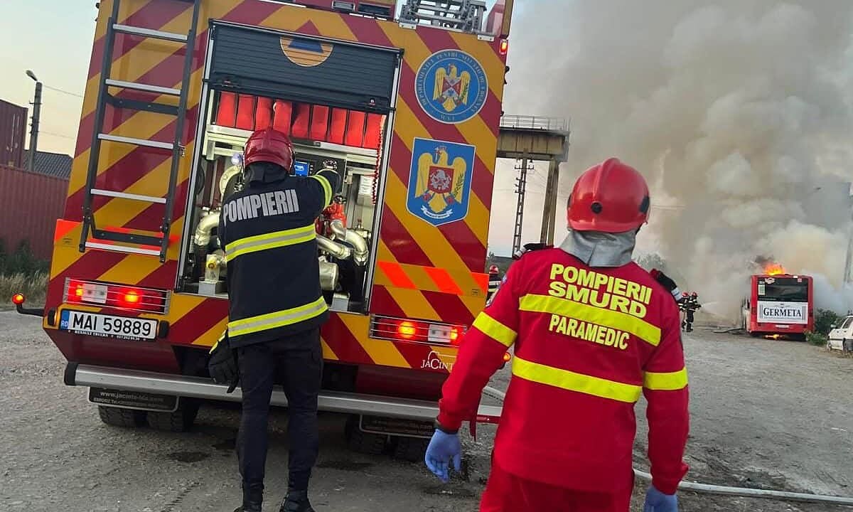 UPDATE: Cauza incendiului ar fi fost fumatul în spații necorespunzătoare. Autobuzul era abandonat în zona respectivă de o perioadă bună de timp, au transmis autoritățile.