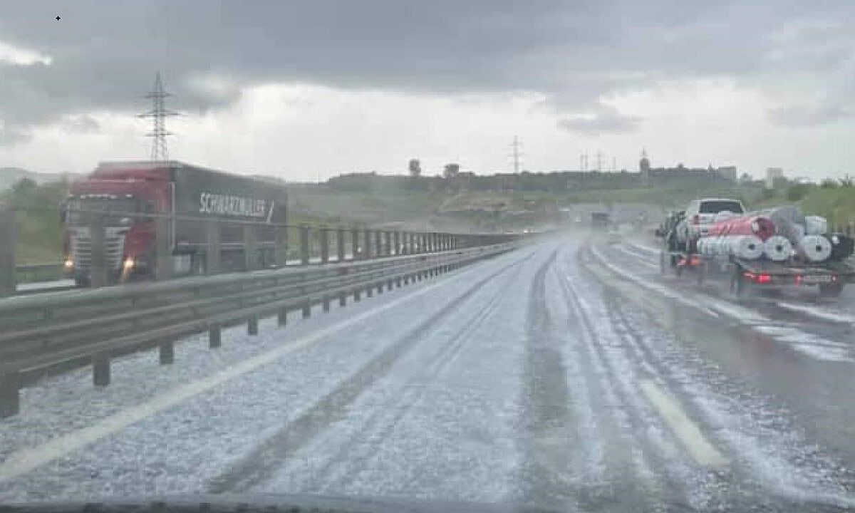 Imagini de iarnă făcute în mijlocul verii Autostrada Transilvania, pe tronsonul Turda - Gilău. O parte a drumului a fost acoperit de gheață, în urma unei ploi torențiale amestecată cu grindină care a lovit zona.