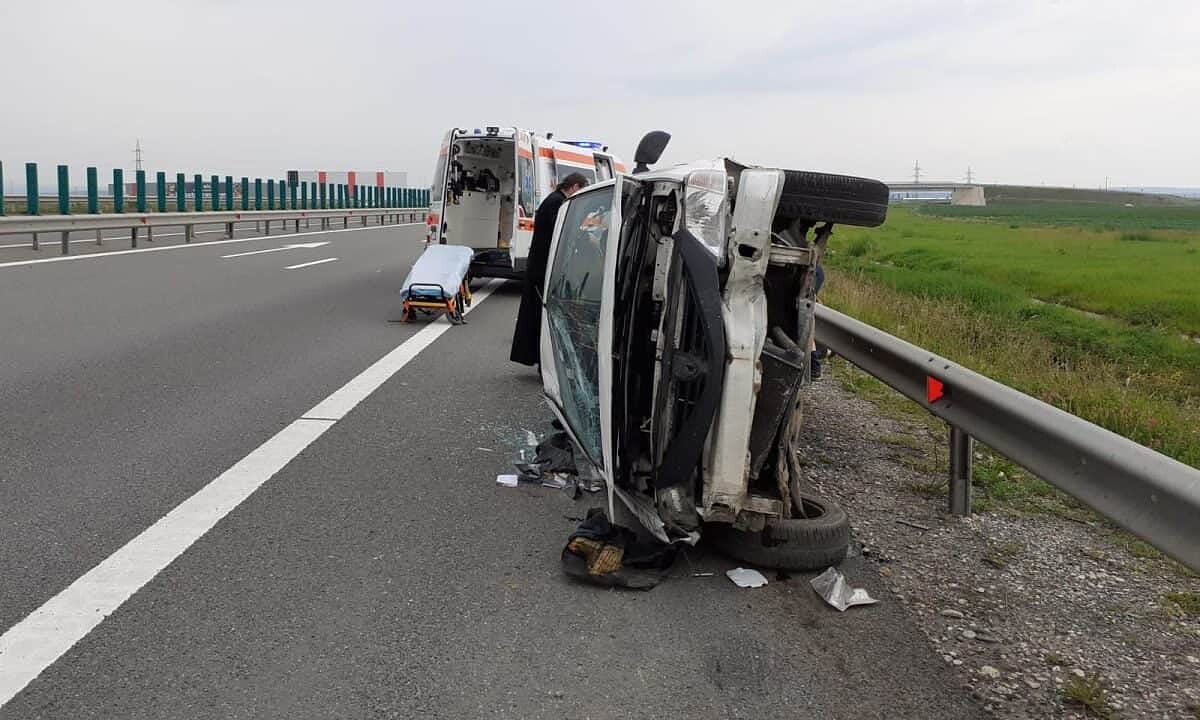 Un autoturism s-a răsturnat sâmbătă pe Autostrada A 10 Sebeș - Turda. Ocupanții mașinii au reușit să iasă, dar un bătrân de 90 de ani a fost transportat la spital.