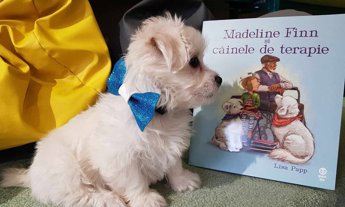 „Acesta este BLUE. BLUE EYES. Câinele nostru de terapie de la bibliotecă.