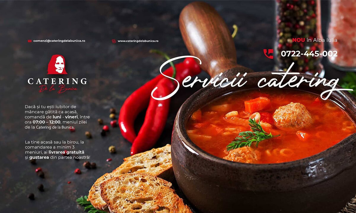 Iubitorii de mâncare gătită ca acasă din zona municipiului Alba Iulia pot descoperi, în meniul zilei la Catering de la Bunica, preparate diversificate, gătite cu pasiune, din ingrediente proaspete și gustoase.
