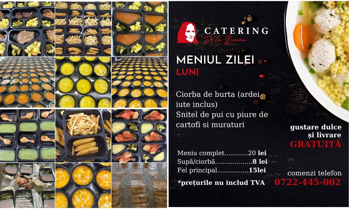 Catering de la Bunica oferă servicii de catering cu meniul zilei în Alba Iulia și împrejurimi. De asemenea, organizează meniuri pentru evenimente private, mese festive, aniversări sau mese de pomenire.