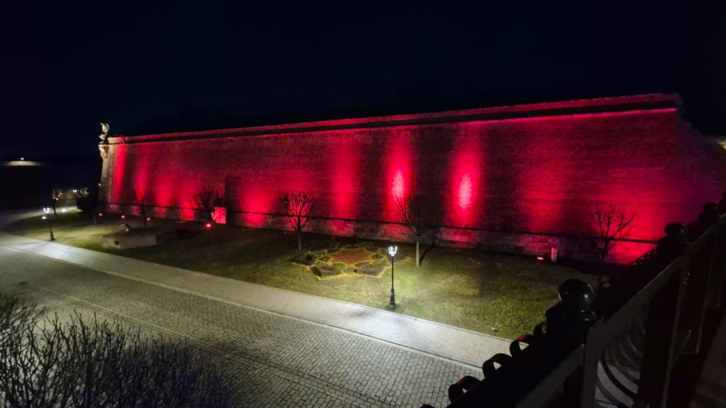O parte a zidurilor Cetății Alba Carolina, aflate în proximitatea Monumentului Unirii, erau și ele iluminate în roșu.